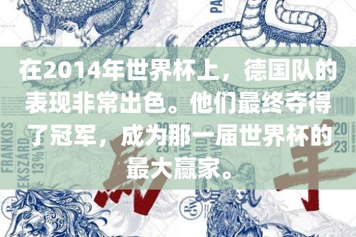 在2014年世界杯上,德国队的表现非常出色。他们最终夺得了冠军,成为那一届世界杯的最大赢家。