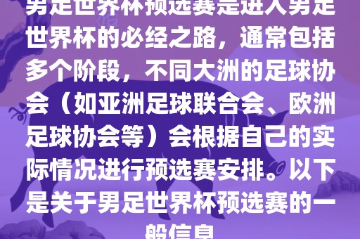 男足世界杯预选赛是进入男足世界杯的重要阶段,需要各支球队认真备战、全力以赴地参加比赛,对于足球迷来说,这也是观赏高水平足球比赛的好机会,如果想要了解具体的男足世界杯预选赛信息,可以关注相关足球协会或赛事官方的消息。
