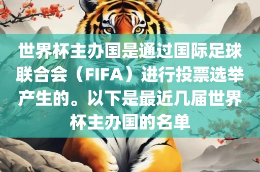 世界杯主办国是通过国际足球联合会(FIFA)进行投票选举产生的。以下是最近几届世界杯主办国的名单