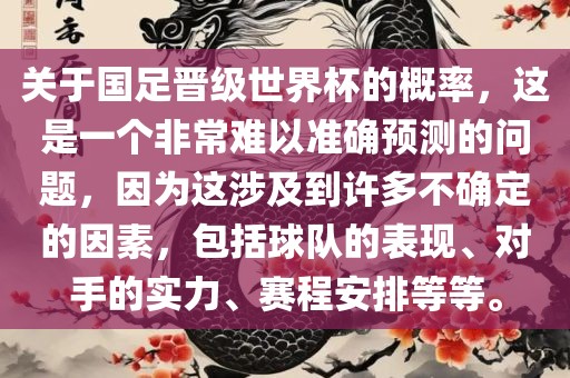 关于国足晋级世界杯的概率难以准确预测,涉及诸多不确定因素,如球队表现、对手实力及赛程安排等。这些因素都可能影响最终的结果。对于国足能否晋级世界杯,目前无法给出明确的结论。