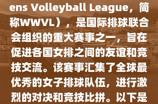 世界女排联赛(World Womens Volleyball League,简称WWVL),是国际排球联合会组织的重大赛事之一,旨在促进各国女排之间的友谊和竞技交流。该赛事汇集了全球最优秀的女子排球队伍,进行激烈的对决和竞技比拼。以下是关于世界杯女排赛的详细信息