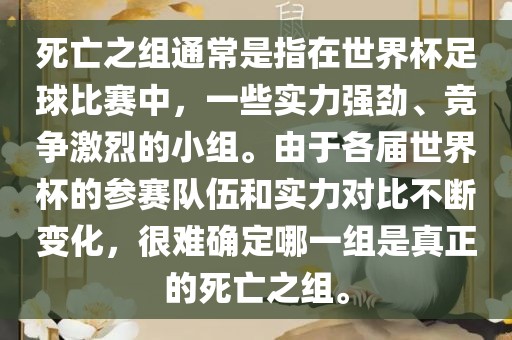 死亡之组通常是指在世界杯足球比赛中,一些实力强劲、竞争激烈的小组。由于各届世界杯的参赛队伍和实力对比不断变化,很难确定哪一组是真正的死亡之组。