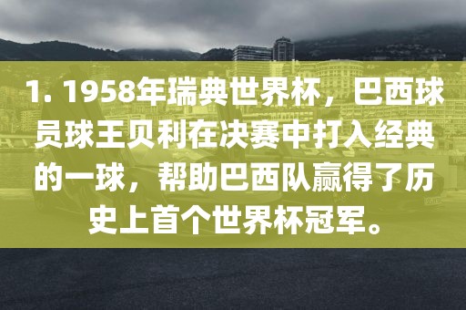 1. 1958年瑞典世界杯,巴西球员球王贝利在决赛中打入经典的一球,帮助巴西队赢得了历史上首个世界杯冠军。