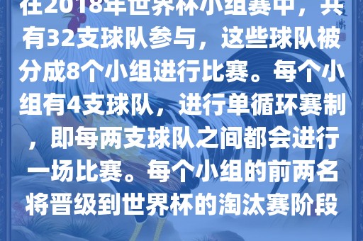 在2018年世界杯小组赛中,共有32支球队参与,这些球队被分成8个小组进行比赛。每个小组有4支球队,进行单循环赛制,即每两支球队之间都会进行一场比赛。每个小组的前两名将晋级到世界杯的淘汰赛阶段。
