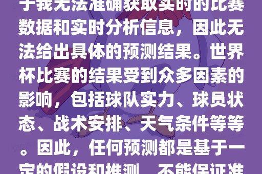 摘要:无法给出关于俄罗斯世界杯的具体预测结果,因为预测涉及众多因素,如球队实力、球员状态、战术安排和天气条件等,且无法获取实时比赛数据和分析信息。任何预测都是基于假设和推测,无法确保准确性。