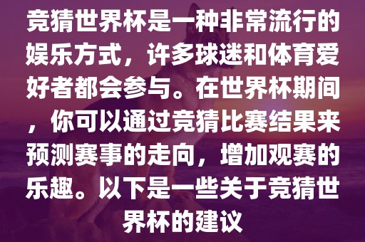 竞猜世界杯是一种非常流行的娱乐方式,许多球迷和体育爱好者都会参与。在世界杯期间,你可以通过竞猜比赛结果来预测赛事的走向,增加观赛的乐趣。以下是一些关于竞猜世界杯的建议