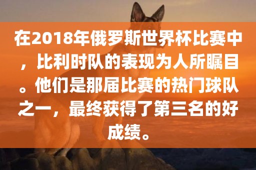 比利时队在2018年世界杯上的表现令人印象深刻,他们的团队精神和实力都展现得淋漓尽致,赢得了球迷们的喜爱和尊重,即使未能夺冠,但他们仍然成为了那届比赛上最出色的球队之一。
