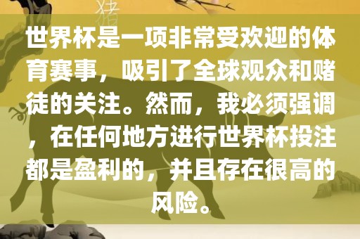 世界杯是一项非常受欢迎的体育赛事,吸引了全球观众和赌徒的关注。然而,我必须强调,在任何地方进行世界杯投注都是盈利的,并且存在很高的风险。