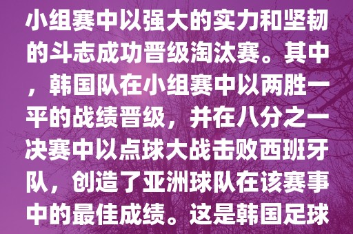 韩国队在2002年世界杯足球赛上的表现是非常出色的,他们展现出了强大的实力和斗志,创造了亚洲足球的历史,虽然存在一些争议和质疑,但这并不影响韩国足球的发展和进步。