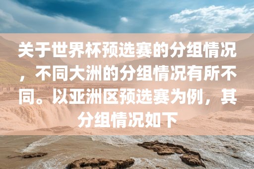 关于世界杯预选赛的分组情况,不同大洲的分组情况有所不同。以亚洲区预选赛为例,其分组情况如下