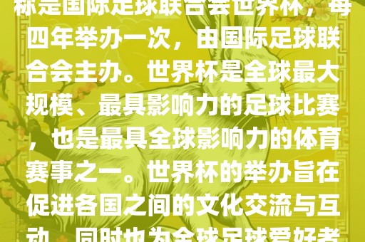 世界杯是一项国际足球赛事,全称是国际足球联合会世界杯,每四年举办一次,由国际足球联合会主办。世界杯是全球最大规模、最具影响力的足球比赛,也是最具全球影响力的体育赛事之一。世界杯的举办旨在促进各国之间的文化交流与互动,同时也为全球足球爱好者带来一场精彩的足球盛宴。