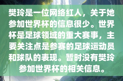 樊玲是一位网络红人,暂无关于她参加世界杯的信息。世界杯是足球领域的重大赛事,关注焦点在于足球运动员和球队的表现。目前未有报道显示樊玲参与这一盛事。摘要字数控制在100-200字以内。