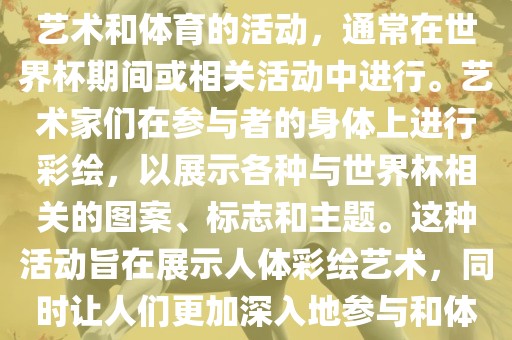 人体彩绘世界杯是一种结合了艺术和体育的活动,通常在世界杯期间或相关活动中进行。艺术家们在参与者的身体上进行彩绘,以展示各种与世界杯相关的图案、标志和主题。这种活动旨在展示人体彩绘艺术,同时让人们更加深入地参与和体验世界杯的氛围。