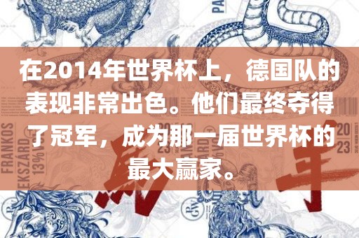 在2014年世界杯上,德国队的表现非常出色。他们最终夺得了冠军,成为那一届世界杯的最大赢家。