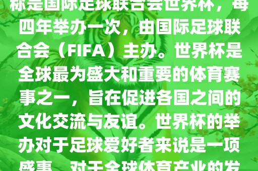 世界杯是国际足球联合会主办的一项国际足球赛事,每四年举办一次。作为全球最盛大的体育赛事之一,世界杯旨在促进各国之间的文化交流与友谊。对于足球爱好者和全球体育产业来说,世界杯的举办具有重要影响,吸引了全球无数观众和球迷的关注。