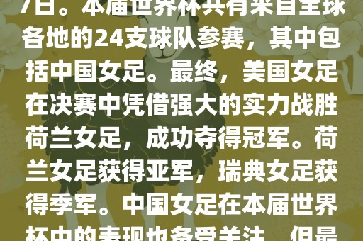 摘要:2019年女足世界杯在法国举行,是首次在欧洲举办的世界杯。比赛时间为一个月,共有来自全球各地的24支球队参赛,包括中国女足。美国女足夺冠,荷兰和瑞典分别获得亚军和季军。中国女足表现备受关注但未进八强。本届世界杯还创造了多项纪录和亮点。