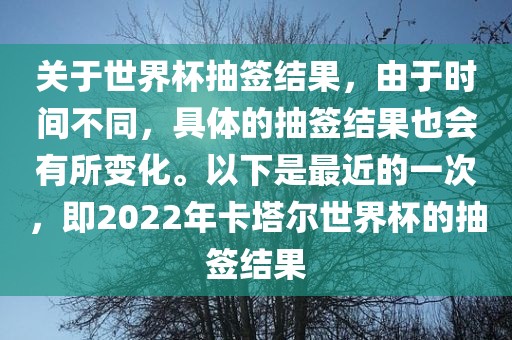 关于世界杯抽签结果,由于时间不同,具体的抽签结果也会有所变化。以下是最近的一次,即2022年卡塔尔世界杯的抽签结果