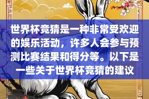 世界杯竞猜是一种非常受欢迎的娱乐活动,许多人会参与预测比赛结果和得分等。以下是一些关于世界杯竞猜的建议