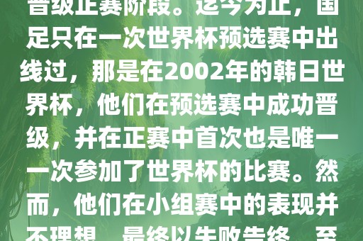 中国男子足球队曾在2002年的韩日世界杯预选赛中成功晋级正赛阶段,这是迄今为止唯一一次参加世界杯的比赛。在小组赛中表现不佳,最终未能晋级。至今,国足尚未再次踢进世界杯。摘要字数在100-200字之间。