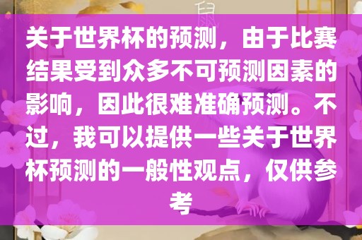 关于世界杯的预测,由于比赛结果受到众多不可预测因素的影响,因此很难准确预测。不过,我可以提供一些关于世界杯预测的一般性观点,仅供参考