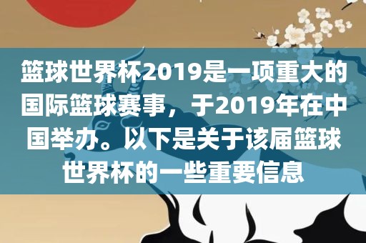 篮球世界杯2019是一项重大的国际篮球赛事,于2019年在中国举办。以下是关于该届篮球世界杯的一些重要信息