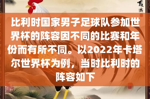 比利时国家男子足球队参加世界杯的阵容因不同的比赛和年份而有所不同。以2022年卡塔尔世界杯为例,当时比利时的阵容如下