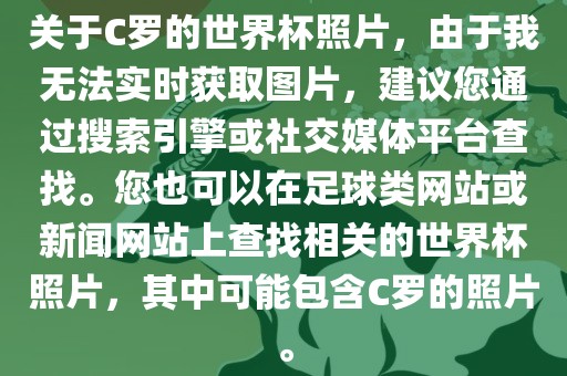 关于C罗的世界杯照片,由于我无法实时获取图片,建议您通过搜索引擎或社交媒体平台查找。您也可以在足球类网站或新闻网站上查找相关的世界杯照片,其中可能包含C罗的照片。