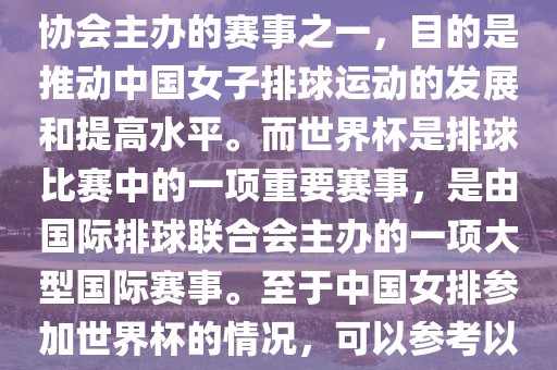 中国女子排球联赛是中国排球协会主办的赛事之一,目的是推动中国女子排球运动的发展和提高水平。而世界杯是排球比赛中的一项重要赛事,是由国际排球联合会主办的一项大型国际赛事。至于中国女排参加世界杯的情况,可以参考以下信息