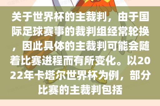 关于世界杯的主裁判,由于国际足球赛事的裁判组经常轮换,因此具体的主裁判可能会随着比赛进程而有所变化。以2022年卡塔尔世界杯为例,部分比赛的主裁判包括