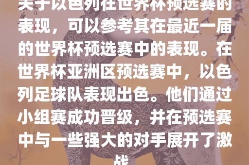 关于以色列在世界杯预选赛的表现,可以参考其在最近一届的世界杯预选赛中的表现。在世界杯亚洲区预选赛中,以色列足球队表现出色。他们通过小组赛成功晋级,并在预选赛中与一些强大的对手展开了激战。