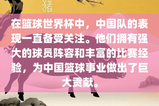 在篮球世界杯中,中国队的表现一直备受关注。他们拥有强大的球员阵容和丰富的比赛经验,为中国篮球事业做出了巨大贡献。