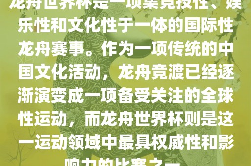 龙舟世界杯是一项集竞技性、娱乐性和文化性于一体的国际性龙舟赛事。作为一项传统的中国文化活动,龙舟竞渡已经逐渐演变成一项备受关注的全球性运动,而龙舟世界杯则是这一运动领域中最具权威性和影响力的比赛之一。