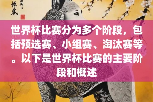 世界杯比赛分为多个阶段,包括预选赛、小组赛、淘汰赛等。以下是世界杯比赛的主要阶段和概述