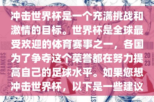 冲击世界杯是一个充满挑战和激情的目标。世界杯是全球最受欢迎的体育赛事之一,各国为了争夺这个荣誉都在努力提高自己的足球水平。如果您想冲击世界杯,以下是一些建议